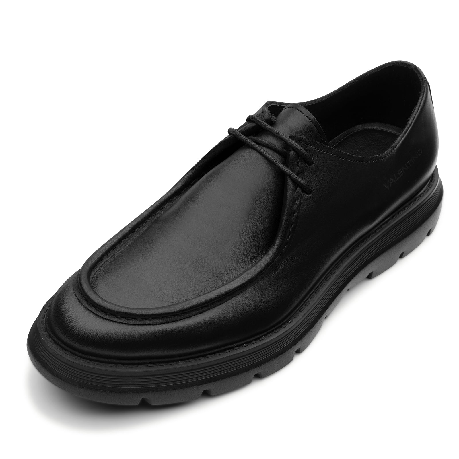 Polacchino VALENTINO. Linee essenziali e materiali pregiati definiscono questo mocassino in pelle nera. La suola in gomma robusta aggiunge un tocco contemporaneo al design classico, rendendolo ideale per affrontare la città con eleganza e comfort. Pensato per l’uomo moderno che cerca uno stile raffinato ma funzionale, è il dettaglio giusto per completare un look metropolitano.